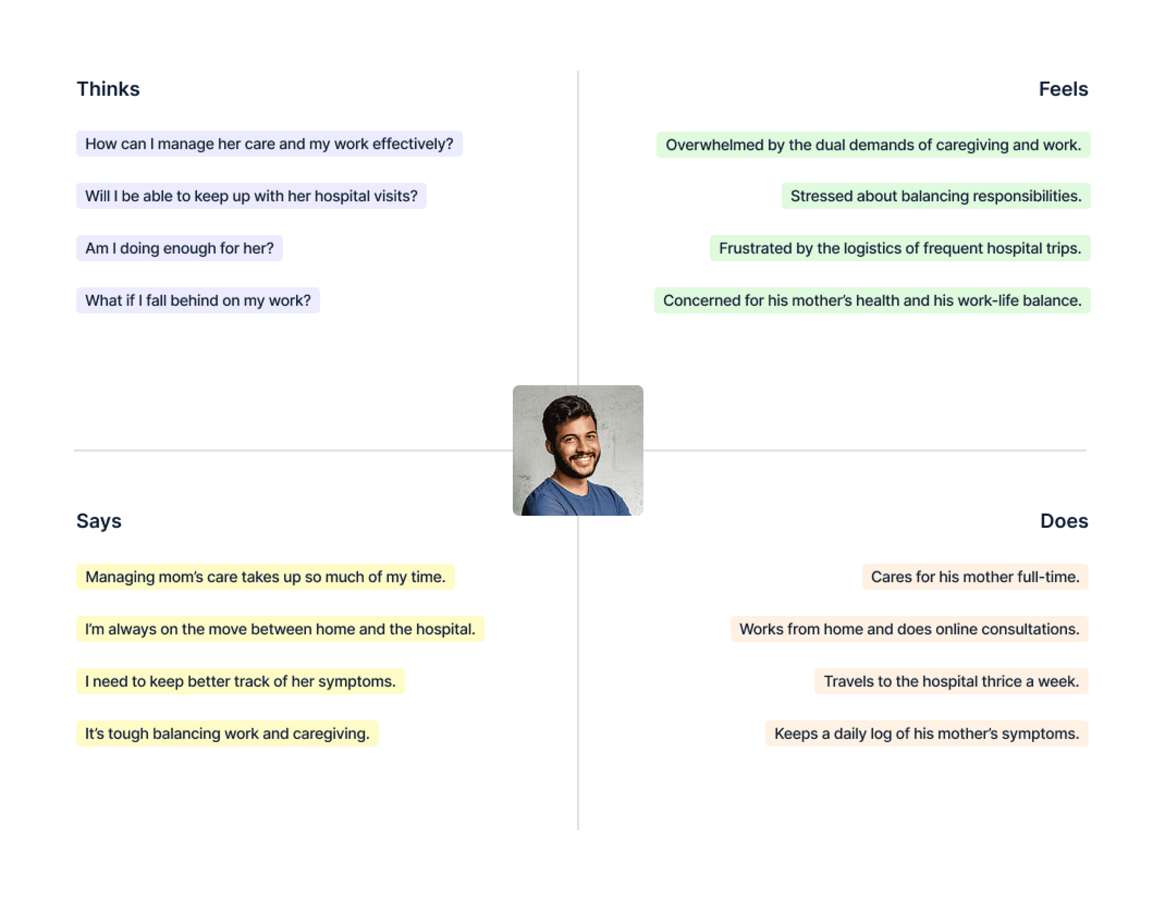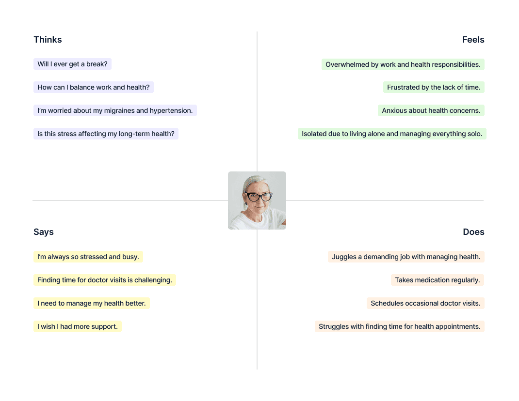 The empathy map of the two user personas shows what the users feel, think, say and do in situations where they have to use the patient portal or when they are dealing with someone who has a medical problem.